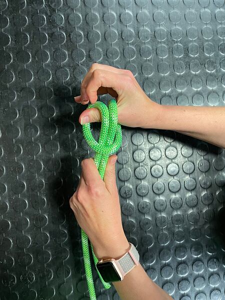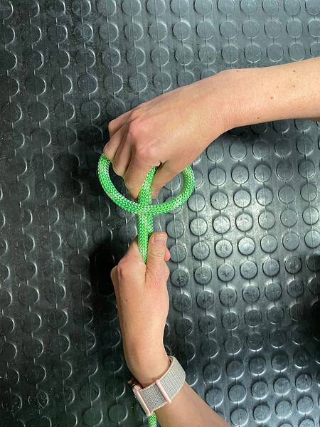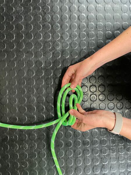 Înainte de a strânge întregul lanț cu al doilea nod, este recomandat să te apleci ușor înainte. Astfel, întreaga legătură dintre hamul de talie și hamul de piept se va strânge uniform.